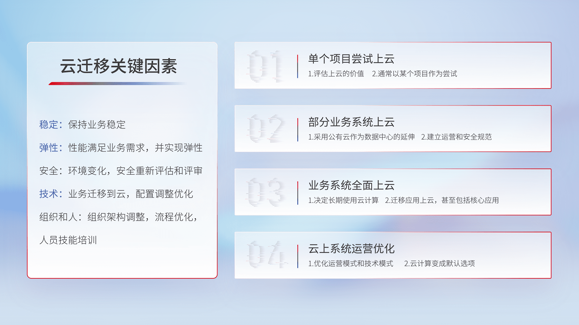 结合实际业务,,从规划设计、、云平台选型、、、云原生改造、、、、数据迁移、、集成交付,,,,迁移全过程为客户识别最佳上云路径,,,,做好风险识别管理,,,,设计网络架构、、身份权限、、、、安全审计合规、、、操作审计、、、、日志审计、、、、监控告警策略、、、多站点容灾设计等,,对云上基础设施进行整体规划,,提升IT治理水平,,以满足弹性、、高可用、、、、高性能的需求。。。